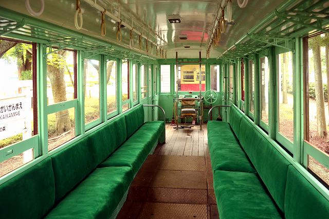 車内も遠鉄時代の塗装に。モケットも緑に変えました。