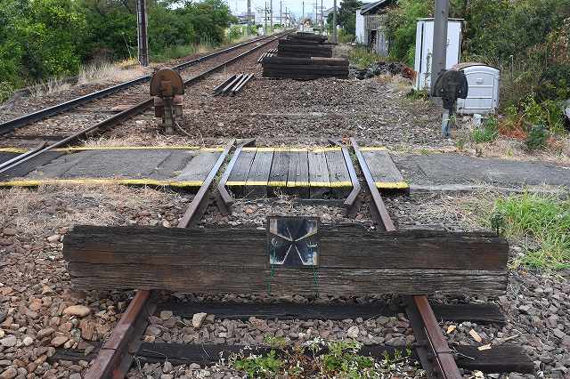 偽複線の線路が撤去され、古枕木が積まれています。