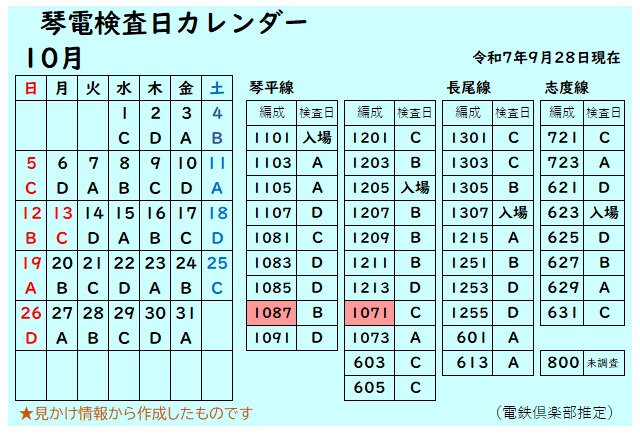 まずは、こちら検査日カレンダー。琴電の電車は基本4日毎に仏生山の西工場で検査をしています。