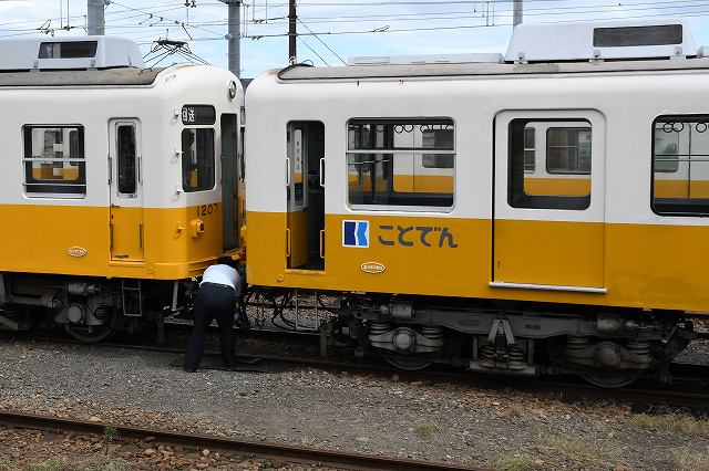あれ? やっぱり1073号を琴平方に連結しています。方向板は滝宮行、と言うことは245列車で出庫、琴平の側線で泊って、明日が12列車で帰ってきますな。とりあえず伏石でバルブしましょか。